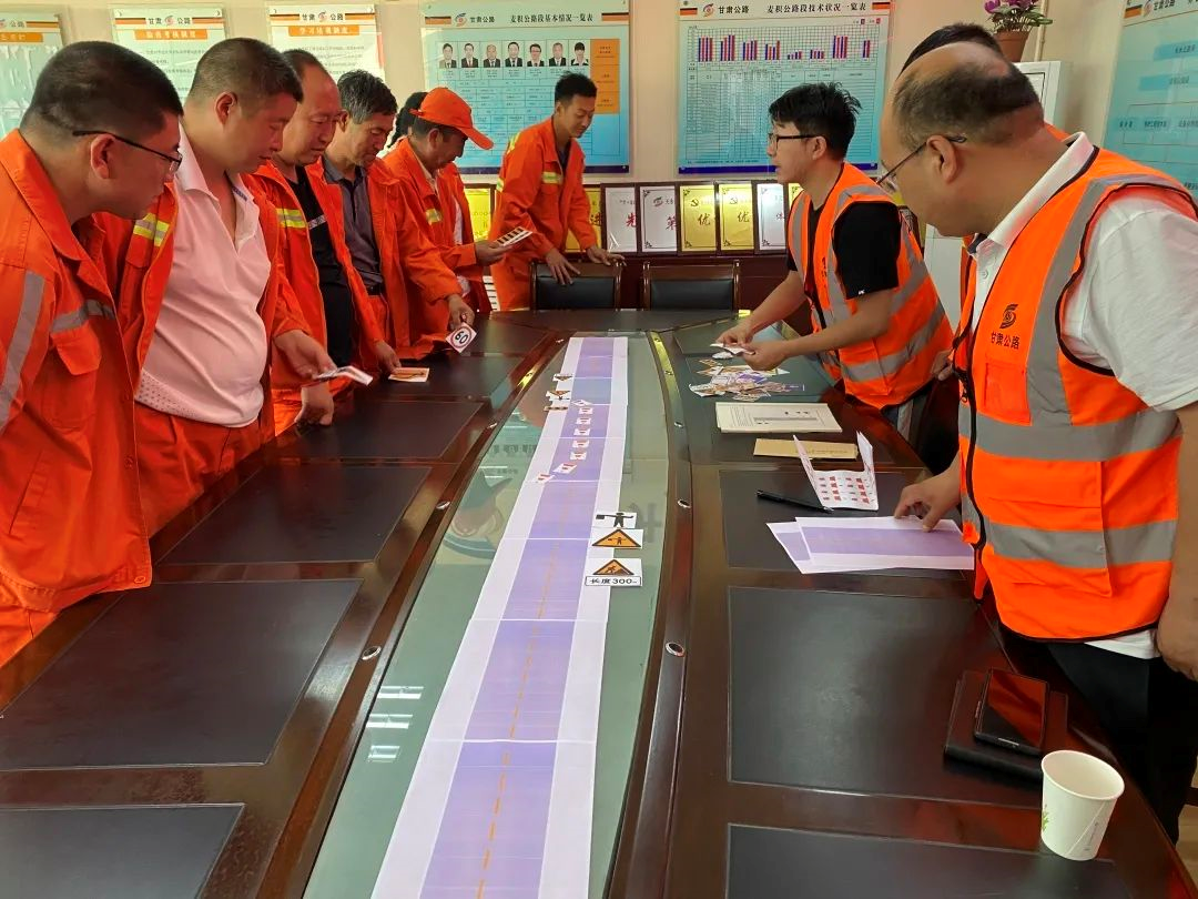 为使培训取得实际效果,该段安全管理员组织职工对规范标准进行了学习,重点讲解了养护作业区布设要求,并以新型桌面推演的方式在会议室内进行模拟布设,按照《GB5768.4-2017道路交通标志和标线第四部分:作业区》国道临时路面作业布设标准进行演练,职工讨论热烈,加深了对安全作业区布设知识的理解。
