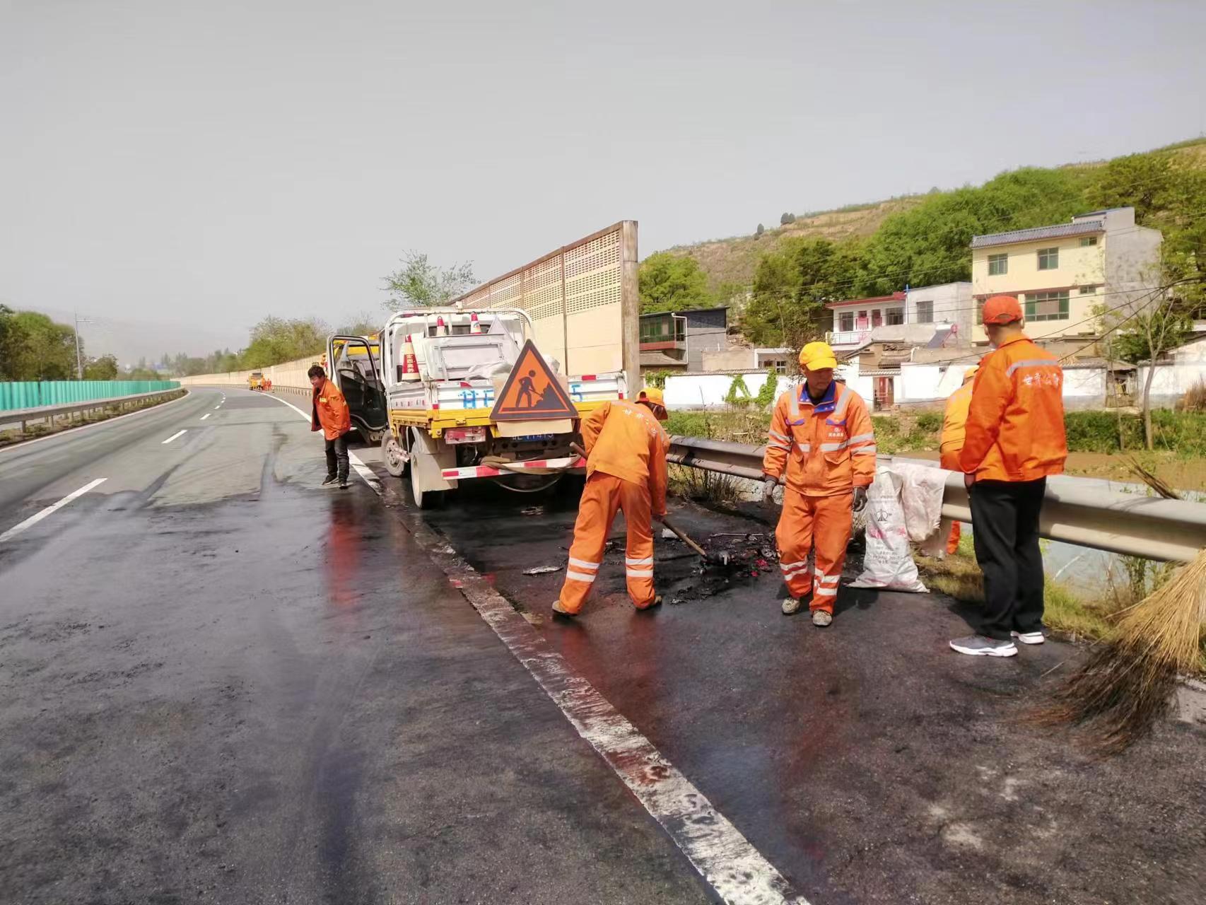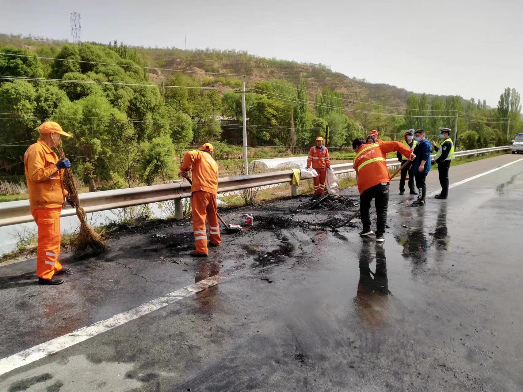 上午9时左右,天水公路事业发展中心高速公路养护所武山工区在养护巡查时,发现G30线天定高速K1475+600处应急车道一辆小客车发生自燃,情况十分危急。巡查人员立即拿上随车灭火器查看现场情况,摆放警示锥桶,协助司机联系交警和消防部门。随后,各相关部门先后抵达事故现场,交警对西行车辆进行交通管制,消防人员对自燃车辆开展灭火处置,清障救援队将自燃车辆拖离现场,养护职工对燃烧后铁片等混杂物进行清理,在各部门的有序配合下,现场明火全部扑灭,道路恢复正常通行。
