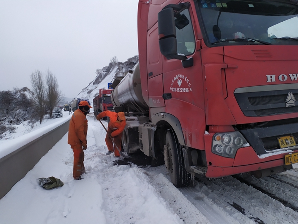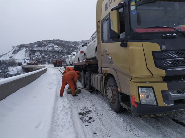 张家川公路段职工在G566线上防滑保畅的过程中,多辆大型货车因路面结冰,车轮打滑无法启动困在半坡上。该段工作人员见此情景,一边协同交警做好交通疏导工作,一边帮助被困车辆安装防滑链,通过铲积雪、撒融雪剂融冰,铺防滑料助力车辆起步等方式帮助被困车辆脱困。