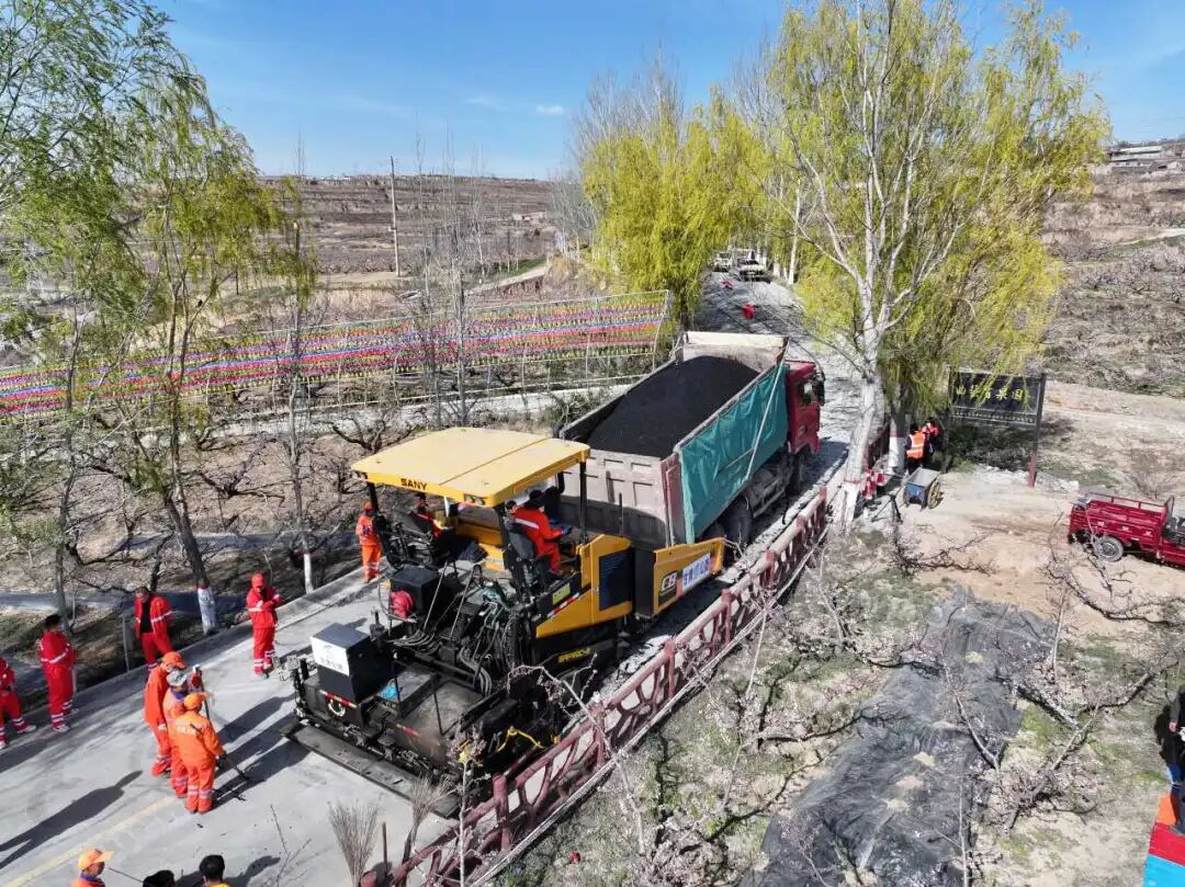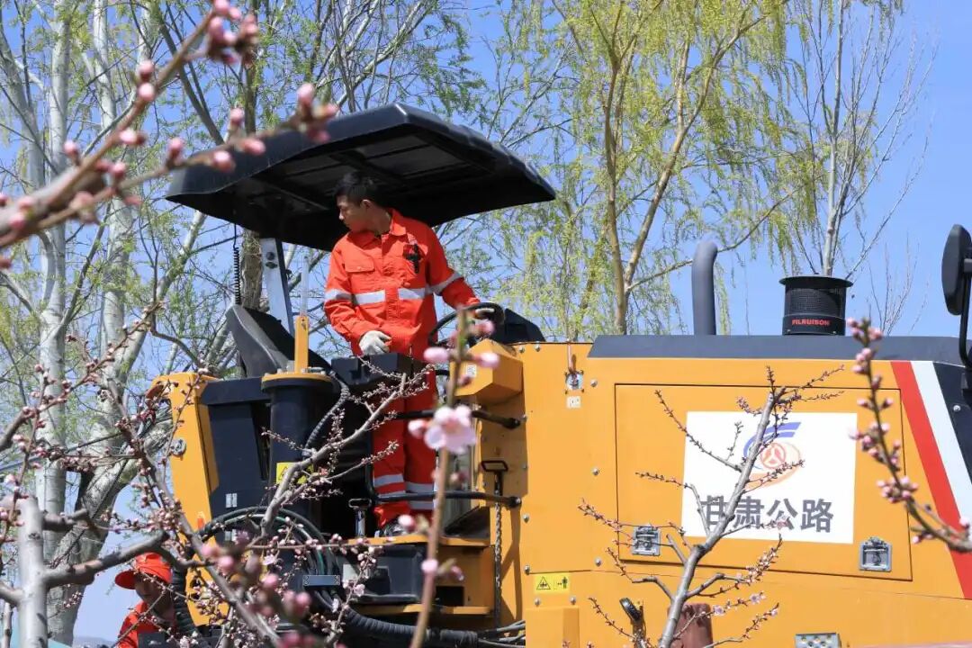 半小时后,我们到了S220线现场,抬眼望去,不远处便是秦安桃花会的主会场,再过两日,八方游客便会慕名而来,从这条路上奔赴花海、踏青赏春。但公路人无暇提前欣赏这抹春色,他们的眼里只有脚下的路。安全组已经先行到达将作业区布设好了,锥桶沿着路中间的虚线一字摆开,警示牌立在前面,“前方施工,减速慢行”几个大字在晨光里格外醒目。