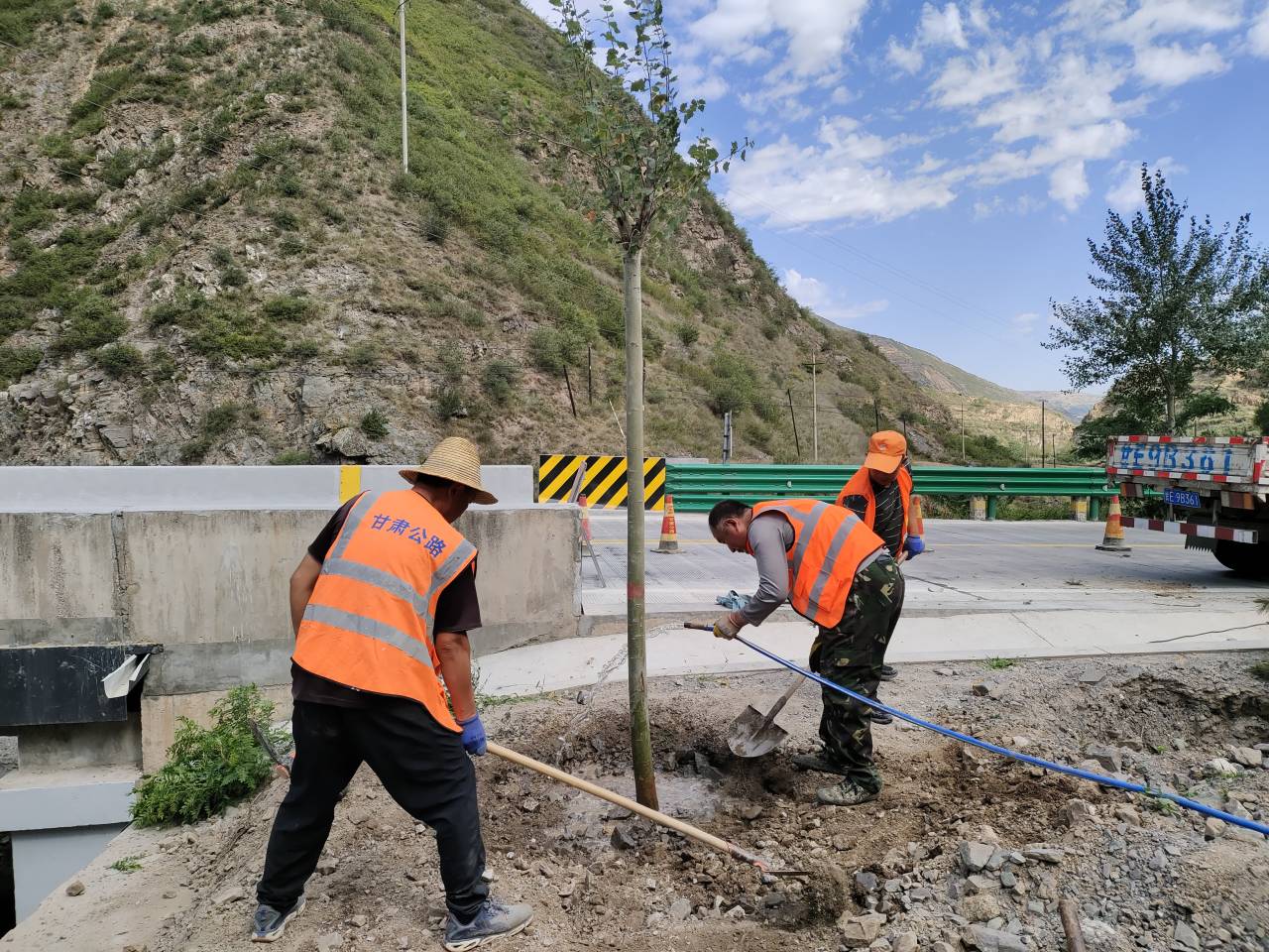 武山公路段及时栽植管护行道树:连日来,武山公路段精心组织,抢抓有利时机,对前期S208线K143+233王上坪桥桥梁养护工程施工增设便道移除的行道树、花草进行栽植、补植,美化了通道环境。工作中,养护人员严格按照“栽一棵活一棵,种一片绿一片”的标准,通过深挖、培土、夯实、浇水等措施做到树正土实,线行优美、整齐,确保栽植一颗,成活一颗。截至目前,共栽植松树、白杨树40余棵,种植花草60余平方米。下一步,该段将持续加强公路沿线绿化带行道树、花草管护工作,扮靓丽辖养道路风景线。(刘志伟)