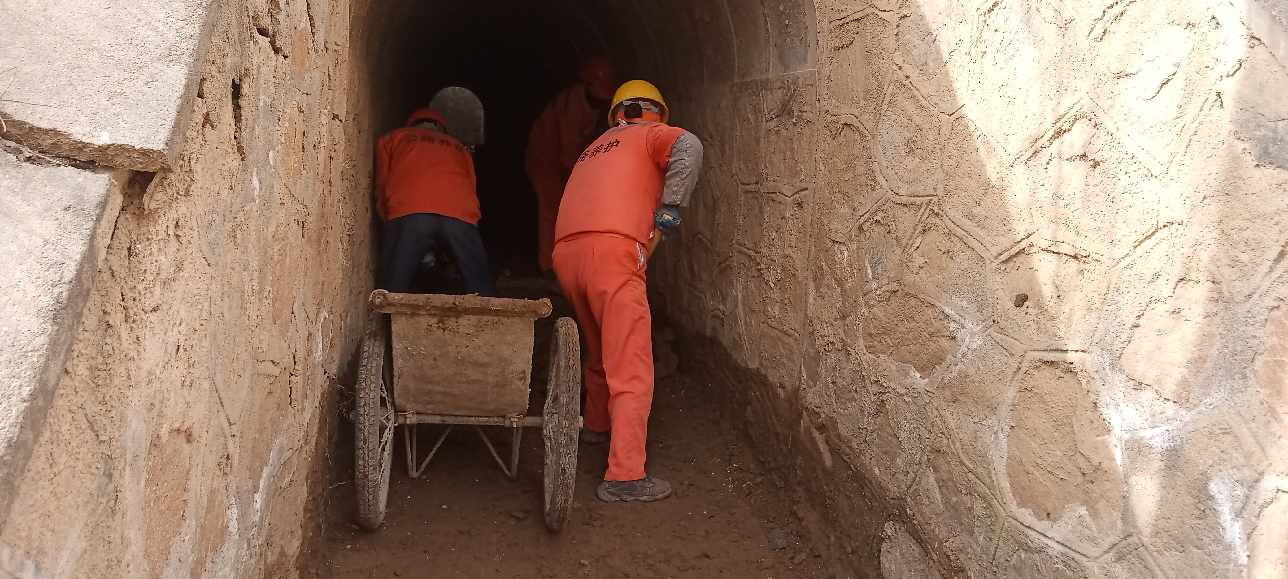 涵洞清淤过程中,麦积公路段采取“人工+机械”相结合的方式有序推进,调配挖掘机对涵洞内部淤积的泥沙和杂物进行集中清理,随后,养护人员进入涵洞内部,对残留的淤泥、枯枝、垃圾等进行细致清除,确保清淤工作全面彻底。针对部分孔径狭小的涵洞,采取轮班作业方式,深入涵洞内进行人工清理,有效保障清淤作业高效推进。针对涵洞外部排水不畅、洞口堵塞等问题,及时整修急流槽,清理涵洞出入口的堆积物,全面恢复涵洞排水功能。同时,组织人员对部分涵洞同步开展内壁冲洗和结构检查,进一步提升排水系统的运行效能和稳定性。