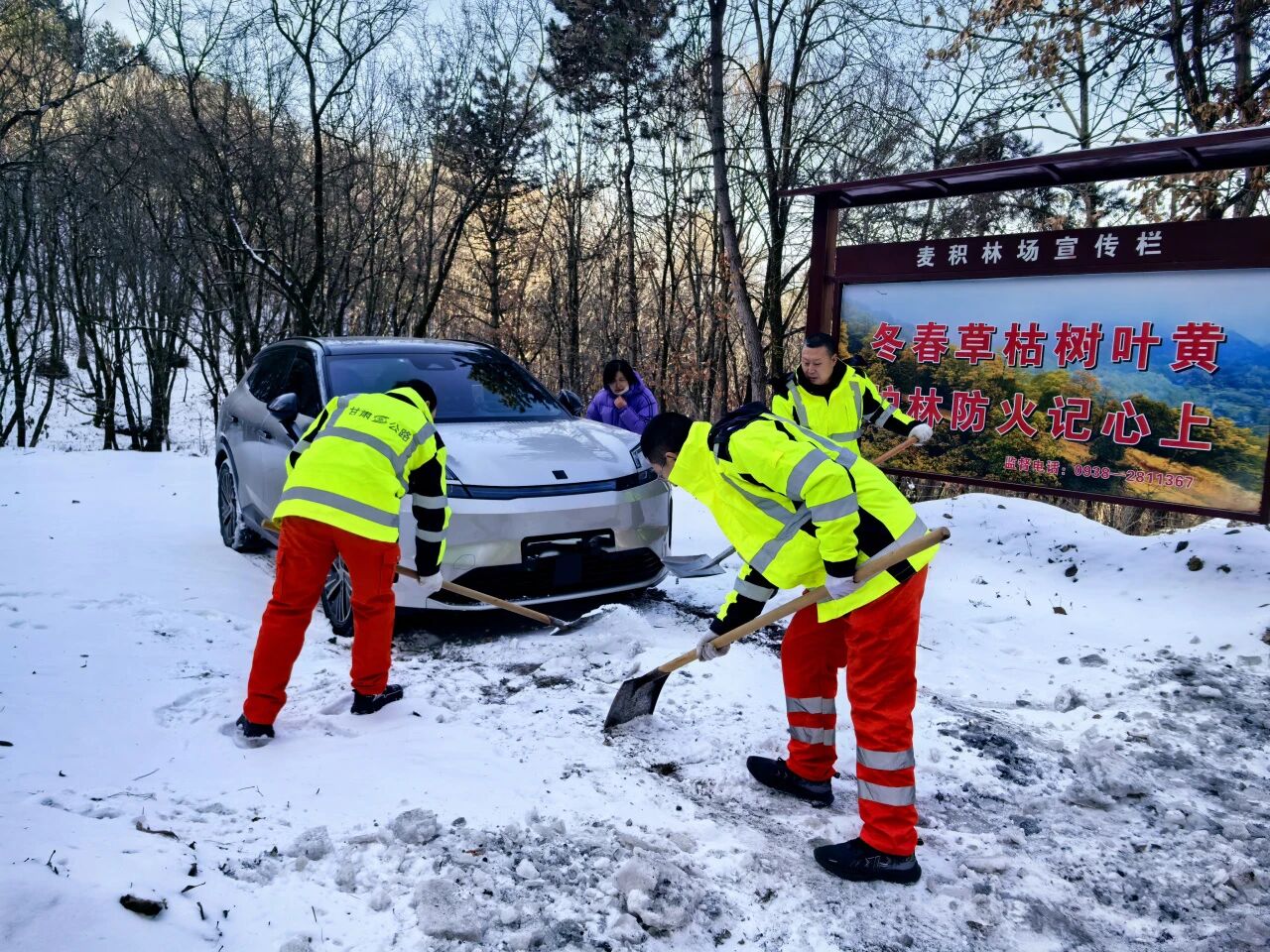 12月12日晚,天水地区普降小到中雪,部分山区路面被积雪覆盖,背阴路段出现结冰。为确保公路安全畅通,高速公路养护所领导班子率先垂范、靠前指挥,带领全体职工集结,于13日7时准时上路除雪防滑。上午10时许,一组作业人员在S218线K204+700处,发现一辆小轿车因轮胎打滑无法前行,车辆滞留在行车道上面临较大安全风险。