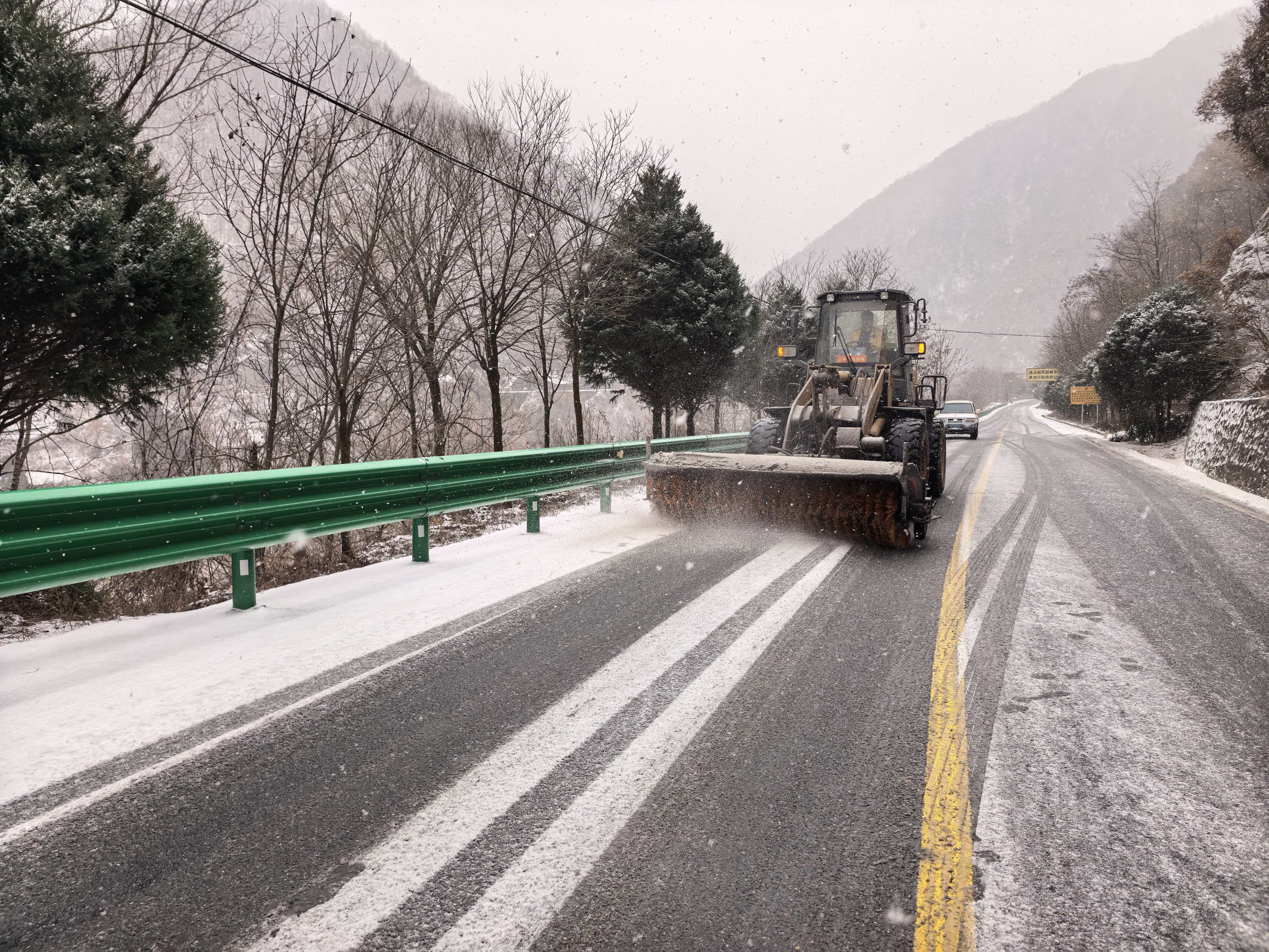 现场采用“机械为主、人机协同”的高效作业模式,除雪滚刷对行车道路积雪进行清理,作业人员则对公路路肩、急弯陡坡等机械作业盲区,开展人工清雪和防滑料撒布工作。全体人员争分夺秒、协同作战,力求在最短时间内清除路面积雪、消除道路通行隐患,全力应对低温降雪天气对道路出行带来的不利影响,切实保障过往车辆和群众出行安全畅通。