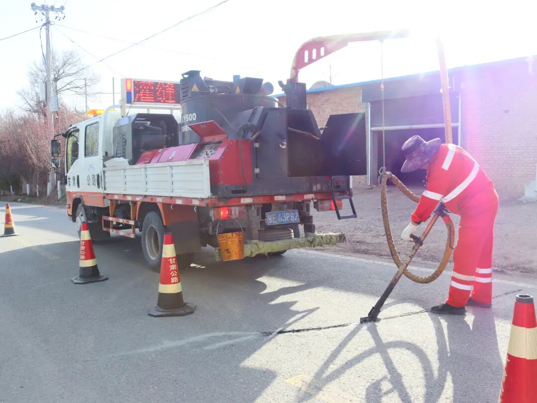 经历了一整个冬天的风雪侵袭,路面裂开了一道道细密的“伤口”。如果不及时处理,春雨渗进去,路基就会泡软,隐患就会埋下。养护工人们弓着身子,推着灌缝机,目光如手术刀般精准地锁定每一条裂缝。黑色的灌缝胶被均匀注入,顺着路面纹理蜿蜒成一道道流畅的曲线——那不是生硬的修补,而是像母亲缝补衣裳一样温柔的“针线活”。