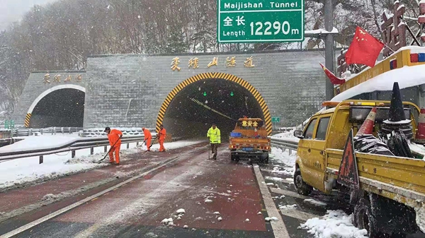 10月24日,受降雪影响,秦州区南部地区出现道路积雪现象,秦州公路段迅速组织人员和设备,在G316线稍子坡、G247线西坡梁路段撒布融雪剂,确保道路安全畅通。(秦州公路段 王琼)
