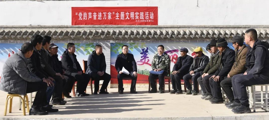 在村委会的院子里,正在开展“党的声音进万家”主题文明实践活动。沿安乡党委代表、马蹄沟村两委干部、党员代表和群众代表以舞台为中心,围成一个同心圆,工会主席朱铁军正在围绕学习宣传贯彻党的二十大精神与乡村振兴、环境卫生整治、产业发展等农村重点工作,用通俗易懂的讲解方式,给大家宣讲党的方针政策,将党的声音传递到基层党员和群众身边。