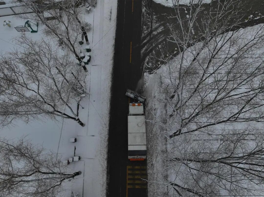 “今天的雪确实大,好几年都没有这么大的雪了。”除雪车上,一名老养护工看着窗外说道。车辆行驶在S323线上,除雪滚刷高速旋转,卷起的雪浪抛向路边,身后的路面渐渐露出黑色。