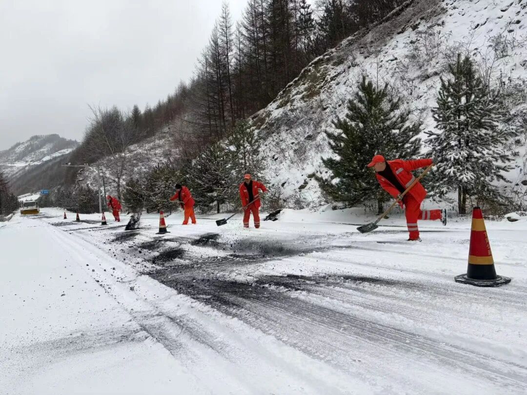 “这段坡道去年冬天就发生过车辆打滑,今天得多撒点。”G566线张家川段的一处陡坡前,几名养护工正在紧张作业。寒风刮在脸上像刀割一样,但他们的动作一点没有放慢。新型防滑料撒布下去,原本光滑的雪面变得粗糙起来,摩擦力明显增加。