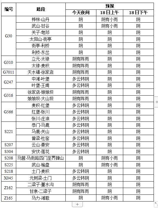 16、S221线泾石路张川县至陇县方向K213+832、K214+009、K214+252、K214+356、K215+944、K216+304(张家川县马鹿镇花园村)等多处路基塌陷,道路半幅通行,预计恢复时间待定。