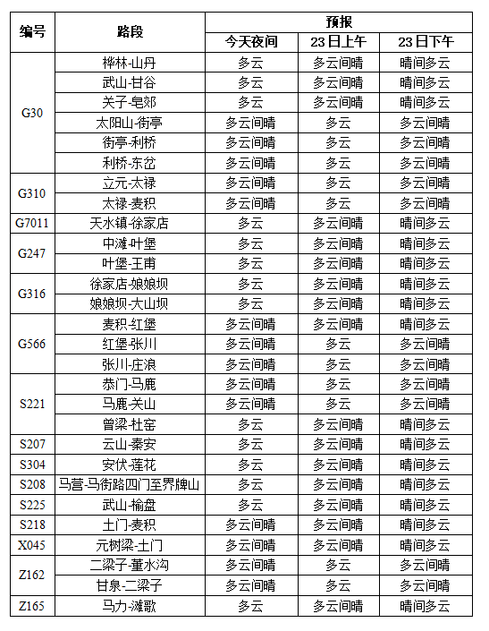 1、G30连霍高速公路下行线(天水至宝鸡方向)太阳山隧道(K1373+375~K1377+172)和甘泉隧道(K1354+535~K1356+245),上行线(宝鸡至天水方向)太阳山隧道(K1373+395~K1377+125)实施养护维修工程。施工路段采取单洞单车道封闭、单车道通行的交通组织方案。计划2022年11月30日完工撤除施工作业现场。 2、S323线陇榜路榜罗至陇县方向K81+400-K81+500(天水市清水县白驼镇朱山新村附近)路肩墙下沉,路基沉陷,路面开裂,目前陇县至榜罗县道路畅通,榜罗县至陇县道路封闭,预计恢复时间延迟至2022年5月31日。