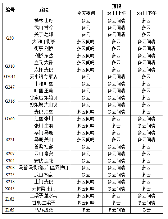 1、G30连霍高速公路下行线(天水至宝鸡方向)太阳山隧道(K1373+375~K1377+172)和甘泉隧道(K1354+535~K1356+245),上行线(宝鸡至天水方向)太阳山隧道(K1373+395~K1377+125)实施养护维修工程。施工路段采取单洞单车道封闭、单车道通行的交通组织方案。计划2022年11月30日完工撤除施工作业现场。 2、S323线陇榜路榜罗至陇县方向K81+400-K81+500(天水市清水县白驼镇朱山新村附近)路肩墙下沉,路基沉陷,路面开裂,目前陇县至榜罗县道路畅通,榜罗县至陇县道路封闭,预计恢复时间延迟至2022年5月31日。