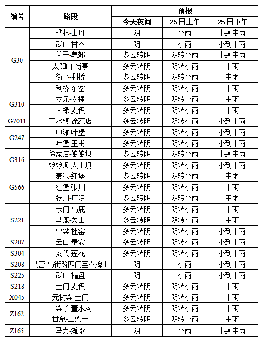 预计今天夜间多云转阴,16~22℃;25日上午阴转小雨,17~19℃;下午小到中雨,其中清水、张家川、麦积中雨,18~20℃。阵风5~6级。