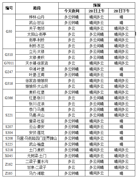 1、G30连霍高速公路下行线(天水至宝鸡方向)太阳山隧道(K1373+375~K1377+172)和甘泉隧道(K1354+535~K1356+245),上行线(宝鸡至天水方向)太阳山隧道(K1373+395~K1377+125)实施养护维修工程。施工路段采取单洞单车道封闭、单车道通行的交通组织方案。计划2022年11月30日完工撤除施工作业现场。 2、S323线陇榜路榜罗至陇县方向K81+400-K81+500(天水市清水县白驼镇朱山新村附近)路肩墙下沉,路基沉陷,路面开裂,目前陇县至榜罗县道路畅通,榜罗县至陇县道路封闭,预计恢复时间延迟至2022年5月31日。