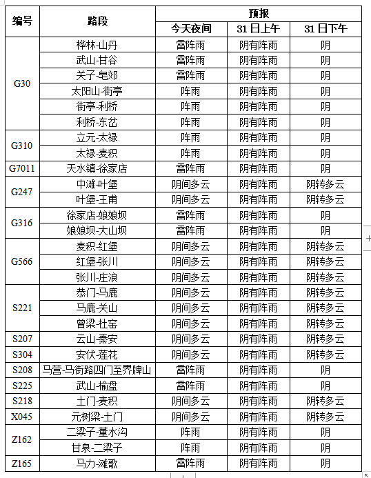 预计今天夜间阴间多云,秦州区、武山县有雷阵雨,麦积区有阵雨,16~21℃;31日上午阴有阵雨,17~22℃;下午阴转多云,20~26℃。偏东风2~3级。