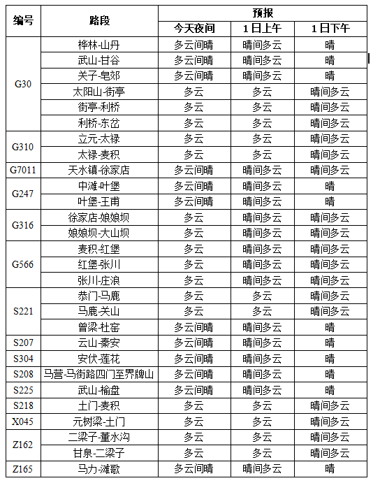 1、G30连霍高速公路下行线(天水至宝鸡方向)太阳山隧道(K1373+375~K1377+172)和甘泉隧道(K1354+535~K1356+245),上行线(宝鸡至天水方向)太阳山隧道(K1373+395~K1377+125)实施养护维修工程。施工路段采取单洞单车道封闭、单车道通行的交通组织方案。计划2022年11月30日完工撤除施工作业现场。 2、S323线陇榜路榜罗至陇县方向K81+400-K81+500(天水市清水县白驼镇朱山新村附近)路肩墙下沉,路基沉陷,路面开裂,目前陇县至榜罗县道路畅通,榜罗县至陇县道路封闭,预计恢复时间延迟至2022年5月31日。