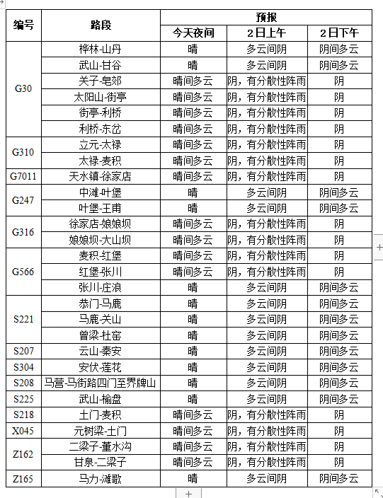 1、G30连霍高速公路下行线(天水至宝鸡方向)太阳山隧道(K1373+375~K1377+172)和甘泉隧道(K1354+535~K1356+245),上行线(宝鸡至天水方向)太阳山隧道(K1373+395~K1377+125)实施养护维修工程。施工路段采取单洞单车道封闭、单车道通行的交通组织方案。计划2022年11月30日完工撤除施工作业现场。 2、S323线陇榜路榜罗至陇县方向K81+400-K81+500(天水市清水县白驼镇朱山新村附近)路肩墙下沉,路基沉陷,路面开裂,目前陇县至榜罗县道路畅通,榜罗县至陇县道路封闭,预计恢复时间延迟至2022年5月31日。