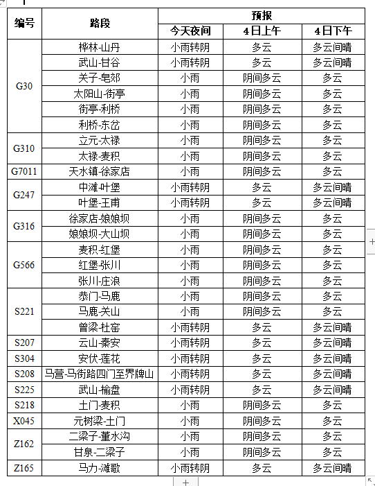 1、G30连霍高速公路下行线(天水至宝鸡方向)太阳山隧道(K1373+375~K1377+172)和甘泉隧道(K1354+535~K1356+245),上行线(宝鸡至天水方向)太阳山隧道(K1373+395~K1377+125)实施养护维修工程。施工路段采取单洞单车道封闭、单车道通行的交通组织方案。计划2022年11月30日完工撤除施工作业现场。 2、S323线陇榜路榜罗至陇县方向K81+400-K81+500(天水市清水县白驼镇朱山新村附近)路肩墙下沉,路基沉陷,路面开裂,目前陇县至榜罗县道路畅通,榜罗县至陇县道路封闭,预计恢复时间待定。