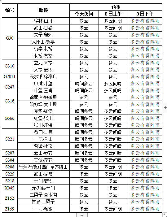 12、S218线隆两路隆德县至清水县方向K103+740-K103+800段(天水市清水县白驼镇申堡村)处,山体失稳,边坡滑塌,路基塌陷,出现缺口。目前隆德县至清水县道路封闭,清水县至隆德县道路畅通。预计恢复时间待定。 13、X202线甘高路麦积区至秦州区方向K2+350、K5+100、K6+200、K6+900、K10+050---K11+600(天水市麦积区甘泉镇胡家窑村至天水市麦积区甘泉镇黄家庄村)处,此路段路基水毁,未施工。麦积区至秦州区方向道路封闭,秦州区至麦积区方向道路通行,预计恢复时间待定。