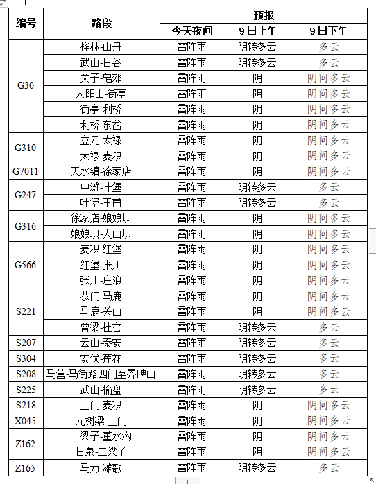 12、S218线隆两路隆德县至清水县方向K103+740-K103+800段(天水市清水县白驼镇申堡村)处,山体失稳,边坡滑塌,路基塌陷,出现缺口。目前隆德县至清水县道路封闭,清水县至隆德县道路畅通。预计恢复时间待定。 13、X202线甘高路麦积区至秦州区方向K2+350、K5+100、K6+200、K6+900、K10+050---K11+600(天水市麦积区甘泉镇胡家窑村至天水市麦积区甘泉镇黄家庄村)处,此路段路基水毁,未施工。麦积区至秦州区方向道路封闭,秦州区至麦积区方向道路通行,预计恢复时间待定。