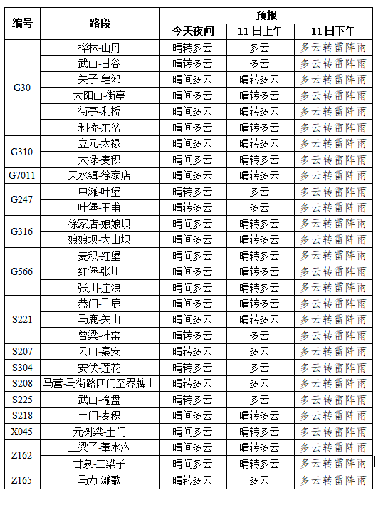 1、G30连霍高速公路下行线(天水至宝鸡方向)太阳山隧道(K1373+375~K1377+172)和甘泉隧道(K1354+535~K1356+245),上行线(宝鸡至天水方向)太阳山隧道(K1373+395~K1377+125)实施养护维修工程。施工路段采取单洞单车道封闭、单车道通行的交通组织方案。计划2022年11月30日完工撤除施工作业现场。 2、S323线陇榜路榜罗至陇县方向K81+400-K81+500(天水市清水县白驼镇朱山新村附近)路肩墙下沉,路基沉陷,路面开裂,目前陇县至榜罗县道路畅通,榜罗县至陇县道路封闭,预计恢复时间待定。