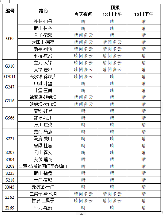 1、G30连霍高速公路下行线(天水至宝鸡方向)太阳山隧道(K1373+375~K1377+172)和甘泉隧道(K1354+535~K1356+245),上行线(宝鸡至天水方向)太阳山隧道(K1373+395~K1377+125)实施养护维修工程。施工路段采取单洞单车道封闭、单车道通行的交通组织方案。计划2022年11月30日完工撤除施工作业现场。 2、S323线陇榜路榜罗至陇县方向K81+400-K81+500(天水市清水县白驼镇朱山新村附近)路肩墙下沉,路基沉陷,路面开裂,目前陇县至榜罗县道路畅通,榜罗县至陇县道路封闭,预计恢复时间待定。