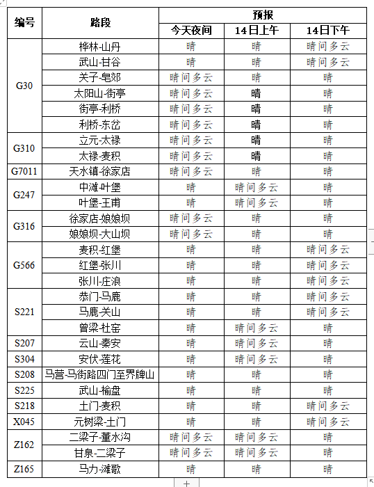 9、G247线K386+989贾家岔中桥(天水市秦安县王甫镇)实施桥梁修复工程。施工期间路段实施半幅施工半幅交替通行方式,计划2022年6月30日完工撤除施工作业现场。 10、G310连共路天水往宝鸡方向K1418+300处和K1422+300处(位于天水市麦积区东岔镇月林村和龙凤村)、K1463+200处(位于天水市麦积区三岔镇毛窝里村)自2022年5月10日开始实施灾害防治修复工程,施工期间部分路段半幅封闭半幅交替通行(天水市至宝鸡方向临时封闭)。预计2022年7月31日完工撤除施工作业现场。