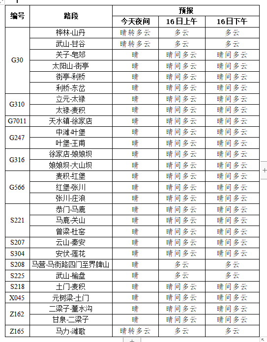 12、S218线隆两路隆德县至清水县方向K103+740-K103+800段(天水市清水县白驼镇申堡村)处,山体失稳,边坡滑塌,路基塌陷,出现缺口。目前隆德县至清水县道路封闭,清水县至隆德县道路畅通。预计恢复时间待定。 13、X202线甘高路麦积区至秦州区方向K2+350、K5+100、K6+200、K6+900、K10+050---K11+600(天水市麦积区甘泉镇胡家窑村至天水市麦积区甘泉镇黄家庄村)处,此路段路基水毁,未施工。麦积区至秦州区方向道路封闭,秦州区至麦积区方向道路通行,预计恢复时间待定。