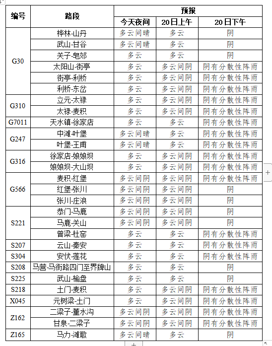 20日下午秦州、麦积、甘谷、秦安、清水阴有分散性阵雨,部分时段有四级以上阵风,对公路正常通行有轻度影响,同时不适宜开展道路施工、养护等工作。