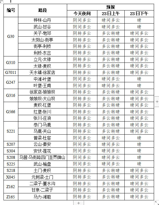 1、G30连霍高速公路下行线(天水至宝鸡方向)太阳山隧道(K1373+375~K1377+172)和甘泉隧道(K1354+535~K1356+245),上行线(宝鸡至天水方向)太阳山隧道(K1373+395~K1377+125)实施养护维修工程。施工路段采取单洞单车道封闭、单车道通行的交通组织方案。计划2022年11月30日完工撤除施工作业现场。 2、S323线陇榜路榜罗至陇县方向K81+400-K81+500(天水市清水县白驼镇朱山新村附近)路肩墙下沉,路基沉陷,路面开裂,目前陇县至榜罗县道路畅通,榜罗县至陇县道路封闭,预计恢复时间待定。