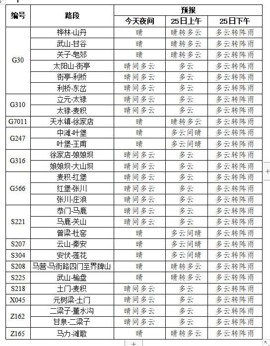 10、S218线隆两路隆德县至清水县方向K103+740-K103+800段(天水市清水县白驼镇申堡村)处,山体失稳,边坡滑塌,路基塌陷,出现缺口。目前隆德县至清水县道路封闭,清水县至隆德县道路畅通。预计恢复时间待定。 11、X202线甘高路麦积区至秦州区方向K2+350、K5+100、K6+200、K6+900、K10+050---K11+600(天水市麦积区甘泉镇胡家窑村至天水市麦积区甘泉镇黄家庄村)处,此路段路基水毁,未施工。麦积区至秦州区方向道路封闭,秦州区至麦积区方向道路通行,预计恢复时间待定。