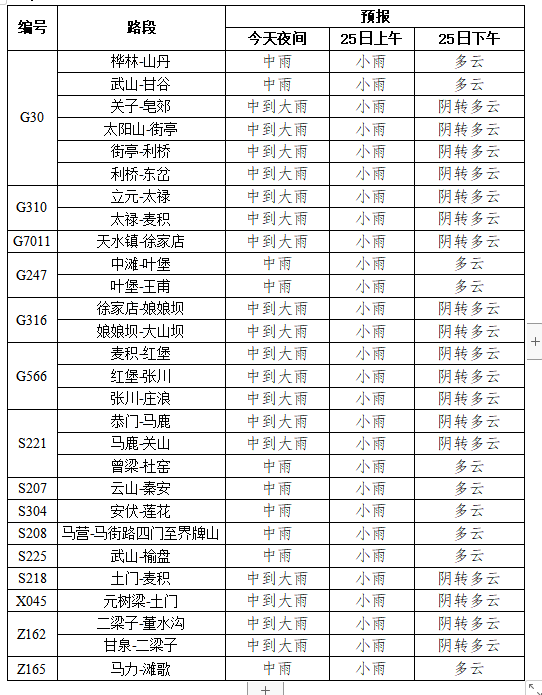 10、S218线隆两路隆德县至清水县方向K103+740-K103+800段(天水市清水县白驼镇申堡村)处,山体失稳,边坡滑塌,路基塌陷,出现缺口。目前隆德县至清水县道路封闭,清水县至隆德县道路畅通。预计恢复时间待定。 11、X202线甘高路麦积区至秦州区方向K2+350、K5+100、K6+200、K6+900、K10+050---K11+600(天水市麦积区甘泉镇胡家窑村至天水市麦积区甘泉镇黄家庄村)处,此路段路基水毁,未施工。麦积区至秦州区方向道路封闭,秦州区至麦积区方向道路通行,预计恢复时间待定。