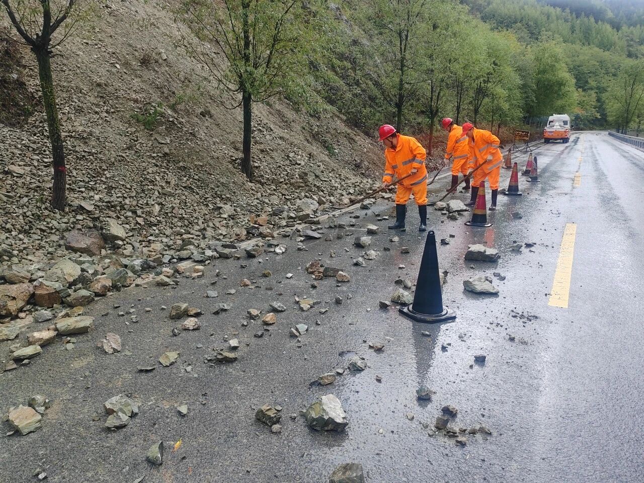 10月12日清晨,巡查组上路巡查时发现G566线、S323线、S218线路面多处出现落石、塌方和泥石流,严重影响道路通行安全,随即调集装载机、挖掘机等机械和抢险人员分别奔赴现场抢修道路。经过连续奋战,多处险段的落石被全面清理。