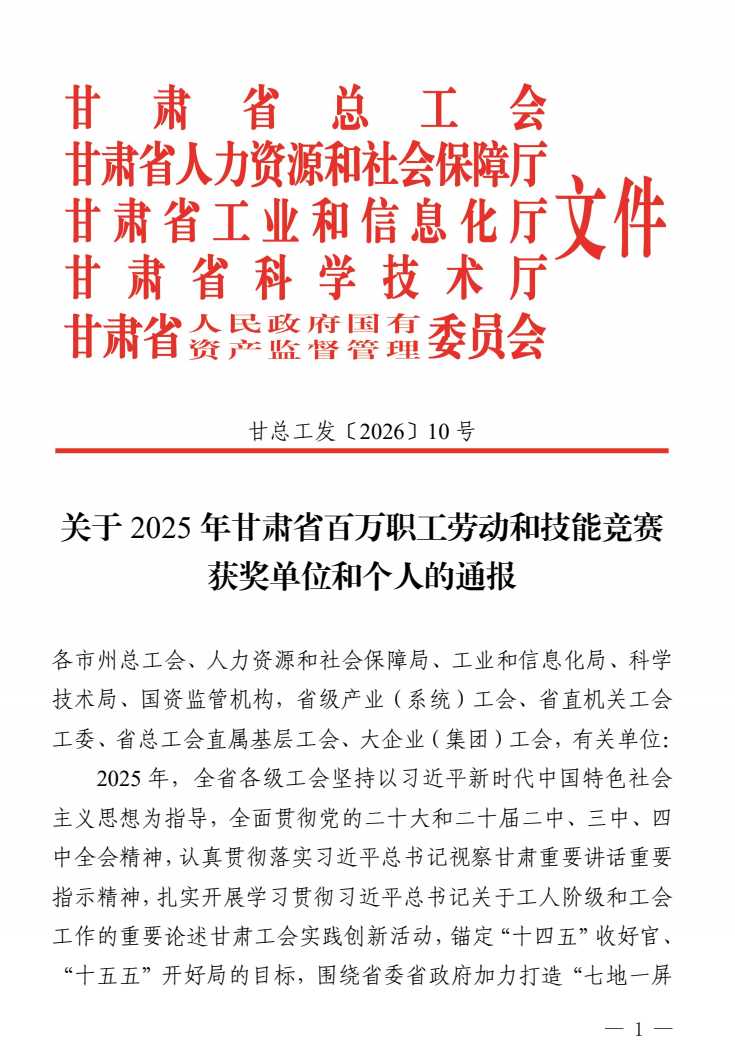 近日,甘肃省总工会等五部门联合印发《关于2025年甘肃省百万职工劳动和技能竞赛获奖单位和个人的通报》,天水公路事业发展中心刘伟强、何威东、王子龙、马艳斌4名职工,凭借精湛技能和出色赛场表现,斩获“甘肃省技术标兵”荣誉称号!