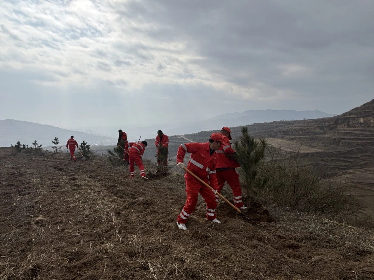 经过一番辛勤劳作,原本空旷的地块很快便栽满了整齐挺拔的新苗。在层层叠叠的山塬上,一株株油松幼苗错落有致、迎风挺立,为春日大地披上崭新绿装,增添了勃勃生机与盎然活力。