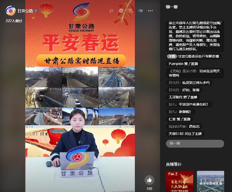 “甘肃公路”官方直播间春节期间向广大司乘朋友提供路况实时信息